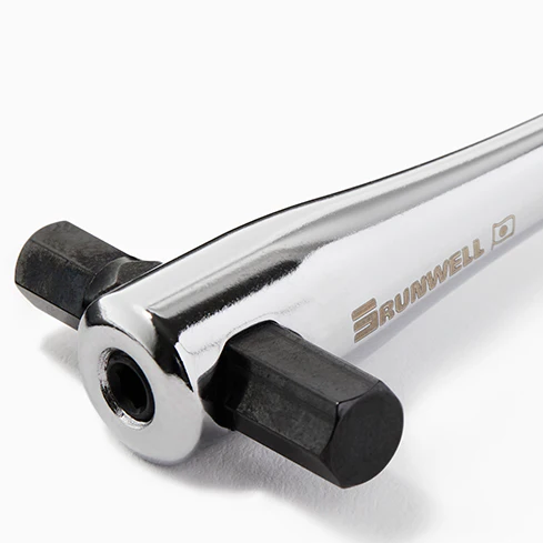 The chrome-plated steel handle fits comfortably in the hand, offering a confident grip and smooth control. A clean Runwell logo is etched on top, with a VO mark positioned between the 5mm and 6mm heads as a subtle finishing touch.